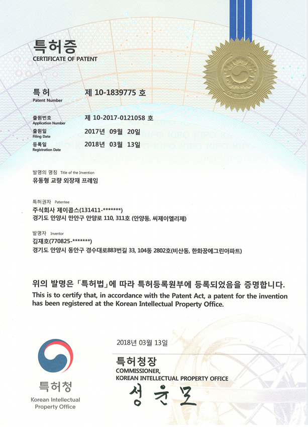 특허증 제10-1839775 - 첨부파일 : 특허증 제10-1839775유동형교량외장재프레임.jpg (295.3K) - 다운로드 6 2023-01-06 09:04:07 이전글 다음글 목록 본문 특허증 제10-1839775
